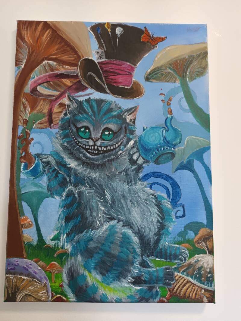 A whimsical acrylic painting on canvas brings the Cheshire Cat from Alice in Wonderland to life with playful charm and vibrant detail. The mischievous feline, painted in bold turquoise and Gray stripes, floats cheerfully among towering mushrooms in a fantastical forest. Its wide, toothy grin and large, gleaming green eyes radiate mischief and curiosity. Balanced atop its head is a large, elaborate hat, decorated with a pink sash, feathers, and a tiny butterfly perched delicately on the brim, that adds a theatrical touch.