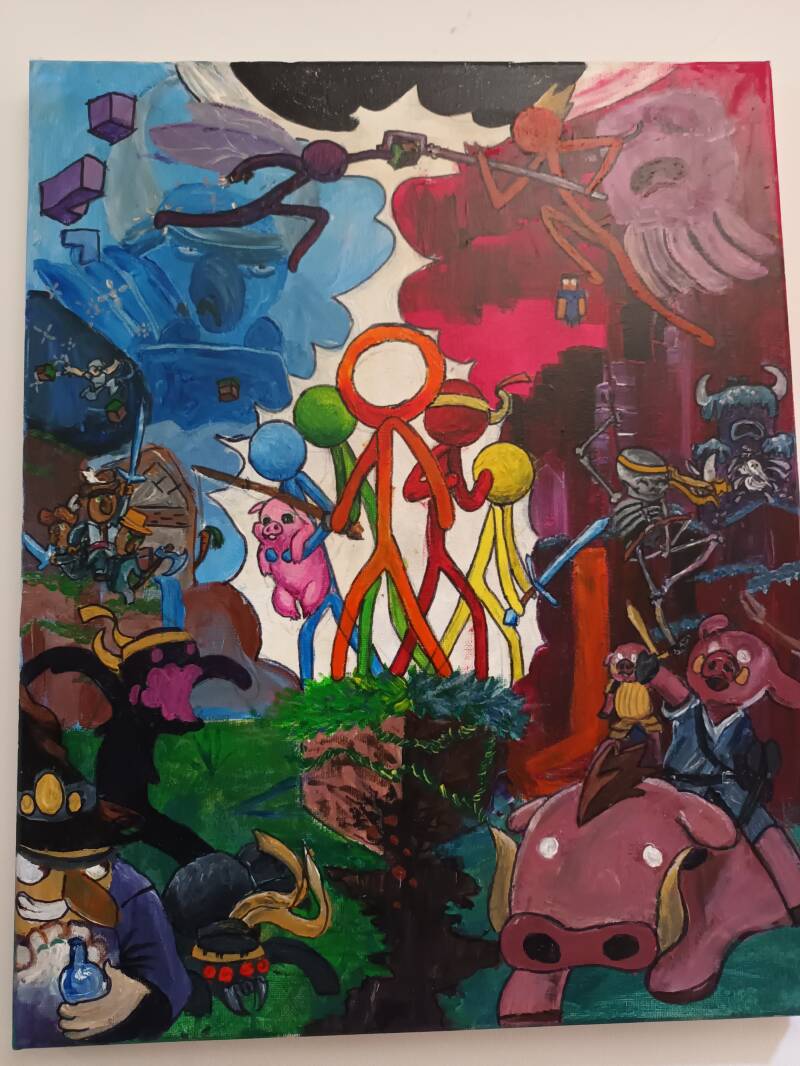 This dynamic acrylic painting pays tribute to Alan Becker’s iconic Animator vs. Minecraft series, capturing the intense energy and creativity of the original stickman battles that took the internet by storm. Painted on a large canvas, the piece brings to life the chaotic brilliance of 5 stick figures inside the pixelated world of Minecraft.